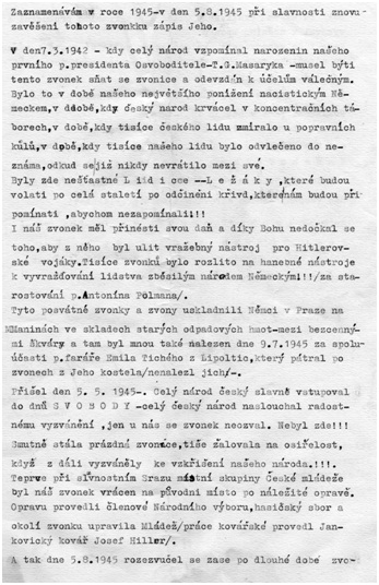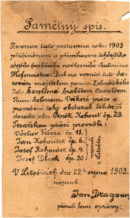 Tyto dokumenty byly nalezeny ve zvoničce při opravě zvoničky v 80. Letech minulého století. Naposledy byla zvonička opravena v roce 2012.Dubový základ zvonice je stále původní.